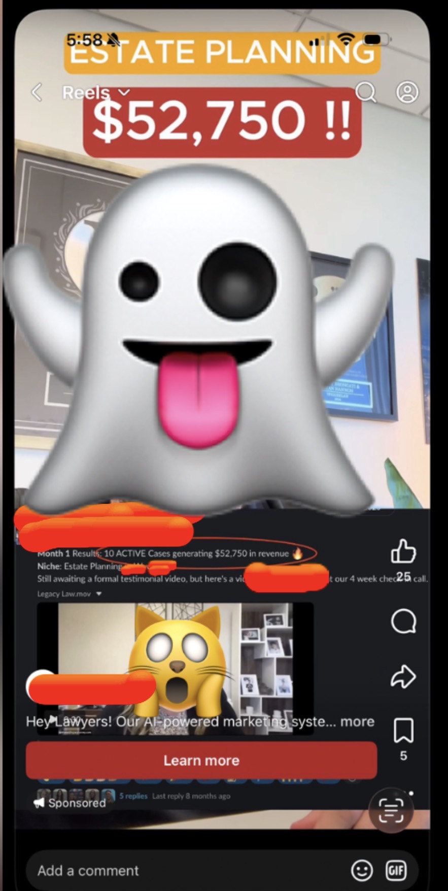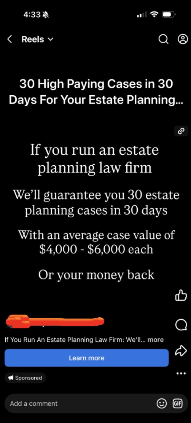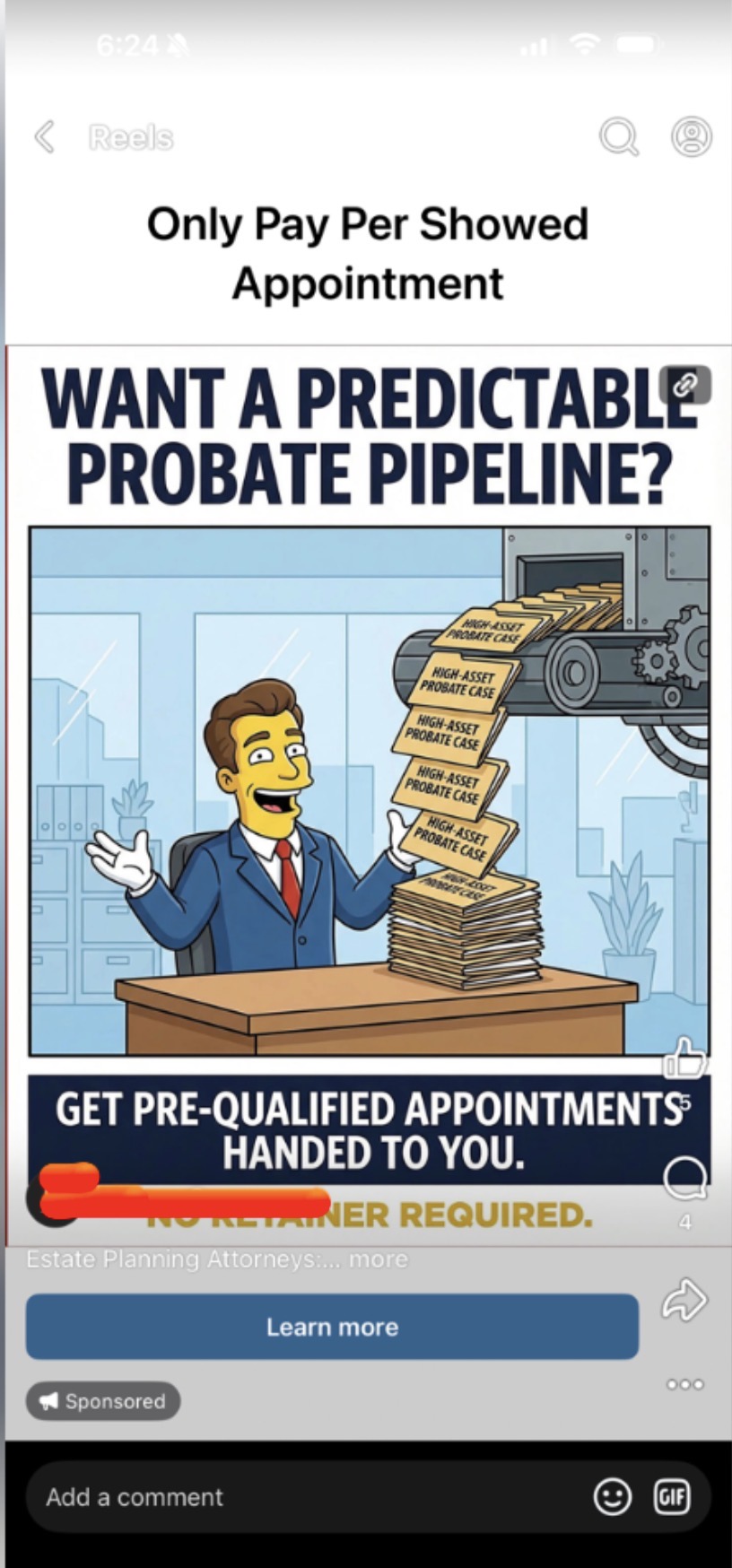 There are attorneys who specialize in finding families right at that moment. Eighteen billion dollars moves through US probate courts every year. That's a lot of business built around a gap in your knowledge. Here's another ad depicting the outdated strategy, profits over people [the conveyor belt is dropping folders that read High-Asset Probate Case}.